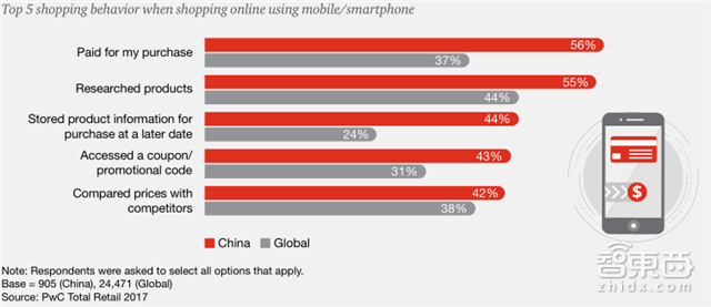 阿里巴巴的移动渗透率持续增加,商品总值从2013年的6%增长至2016年十二月的80%,几乎挤压掉了PC端份额。移动端逐渐成为互联网的重要环节,这导致零售商和品牌方开始注重移动平台,例如在微信上嵌入忠诚度计划,进行客户关系管理等;京东也在与微信合作购物平台;41%中国消费者(全球34%)使用社交网络平台获得促销优惠。