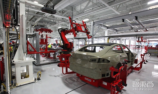 (特斯拉将工厂内的机器人也喷成了红色)