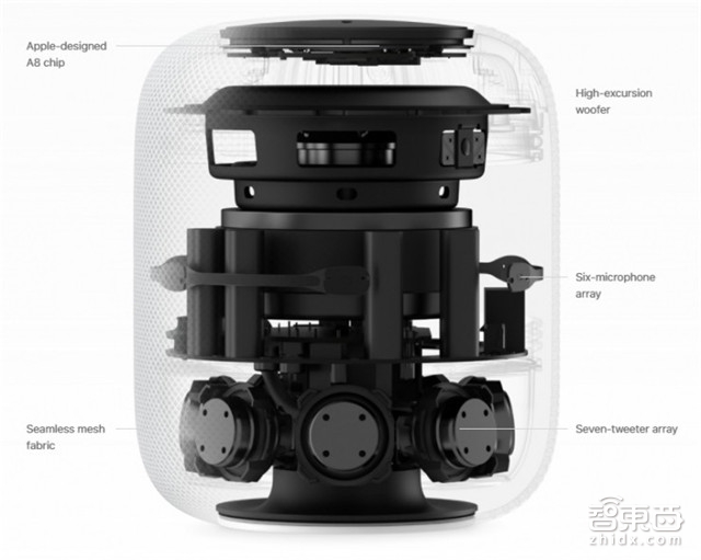 HomePod底部采用了6个波束形成的高频扬声器阵列,并在底部放置了一个4寸的低频扬声器,灌以自动低音均衡、动态建模等音效算法和Spatial awareness空间沉浸技术,以及A8处理芯片,还能与故有产品线Apple Music结合,算是比较全面的提升了音频体验。