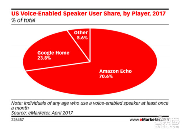根据eMarketer今年4月数据显示,亚马逊Echo美国市场占有率达70.6%,远远领先于第二名 Google Home的23.8%以及联想、LG、Harman Kardon等其他品牌。市场调研机构StrategyAnalytics指出,2016年智能音箱全球出货量590万台,并将在2022年增长10倍,市场价值达到55亿美元。