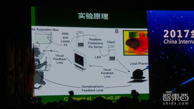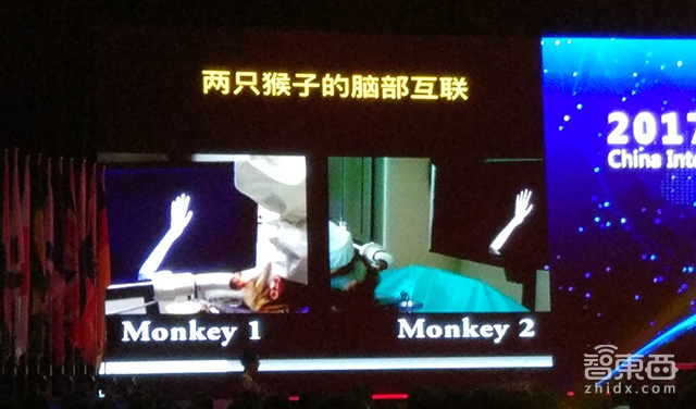这种人机交互不只能在一个大脑中发挥作用,还可以实现多个大脑的协作,即脑联网。接着尼科莱利斯讲述了其在杜克大学实验室里多个猴子大脑同时协作的案例。在虚拟3D环境中, 有XYZ三个坐标,一个猴子操作X轴,一个猴子操作Y轴,另外一个猴子操作球,为了让虚拟手臂运动,三只猴子大脑联动时才能控制好。并且它们做到了,它们能同时三个大脑连作。