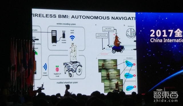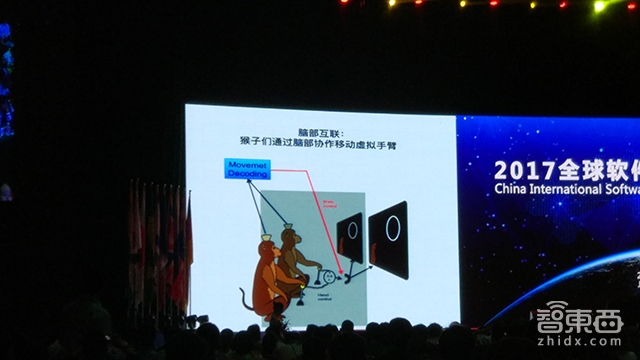 尼科莱利斯曾在猴子身上做过实验,猴子可以用自己的大脑信号来控制一个机器。具体而言,猴子可以用操纵杆来玩电脑游戏,首先它用控制杆来控制光标,这个光标是它的目的,它通过光标来协调自己大脑的功能和想实现的游戏目标。它慢慢越来越熟悉这个过程,尼科莱利斯团队就控制猴子的脑电波波活动,转化成数字命令,然后将其传输给一个机器人。当猴子和机器人可以一起协调的时候,它就不需要用手操纵控制杆,而是直接通过脑部活动就可以驱动机器来玩游戏,这就实现了脑机对接。