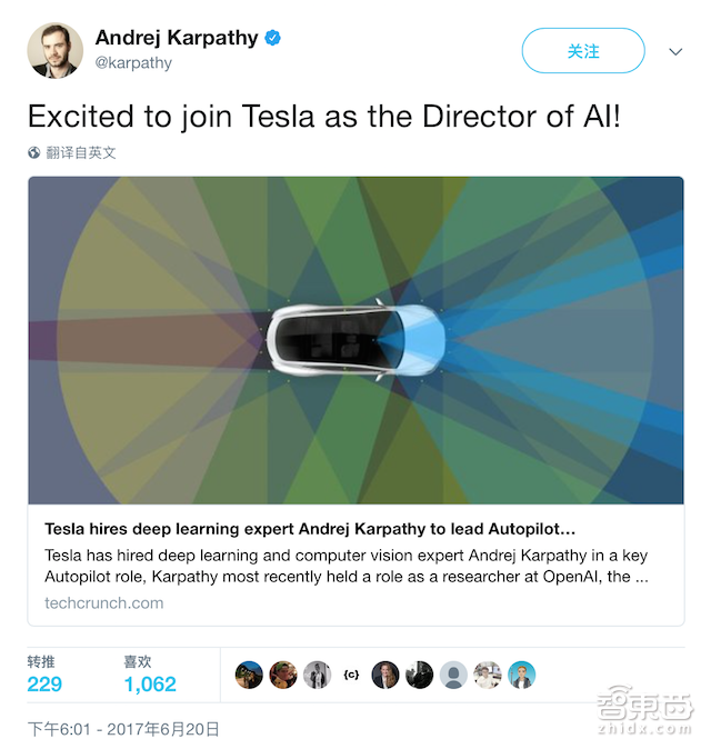 智东西6月21日消息,今天,前Open AI研究员、斯坦福大学博士Andrej Karpathy宣布加盟技汽车公司特斯拉,担任人工智能及自动驾驶视觉总监,直接向马斯克将汇报。