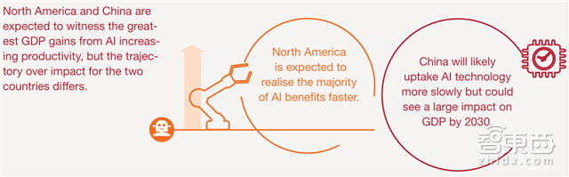 北美由于成熟的技术准备和资本优势,结合数据接触点和信息流、洞察力,潜在GDP增长在AI技术早期(至21世纪20年代中期)将是发展最快的地区,随后(约十年),生产力逐渐追赶上来的中国将表现出更为强劲的增长。这主要获益于资本再投资和企业利润前景/投资回报率:除了中国市场本有的发展前景,伴随着这十年的AI商业模式转变则包括价值链延展,也就是AI能带来更尖端、高技术驱动的生产力推动。
