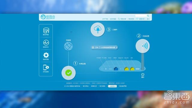 极路由3 的图形化的界面非常不错,左边是路由存储、系统状态、高级设置和手机控制等大板块。而且“傻瓜式”向导适合各个年龄群,右侧可以看到看到上图中的1、2、3了吗?分别对应的外网连接、无线设置和云插件等。只要轻松简单的三步,我们已经能够正常上网了。