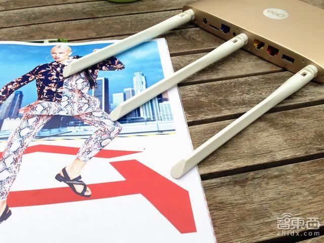 极路由3 采用了三根十分霸气白色的天线,与前代极路由不同,它是不可拆卸。极路由3 相比极路由2 多一根天线,而且三根天线的角度扭转十分自由,垂直方向可以进行45°的转动,左右旋转最多可达180°,基本上可以随意摆弄它们。