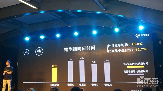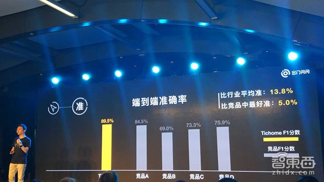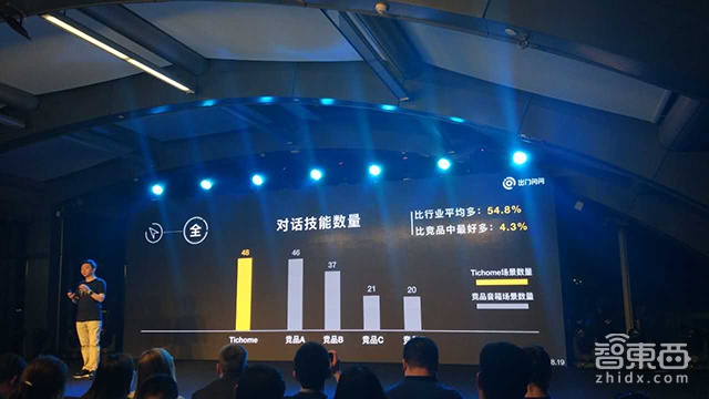 接着,李志飞展示了在一个接近真实使用场景下,问问音箱和其他竞品音箱的对比情况,通过李志飞提供的数据来看,问问音箱在唤醒率、误唤醒率端到端响应时间(包括静默时间)、端到端准确率(准确完成任务)、对话技能数、多轮对话等方面都高于同行产品。