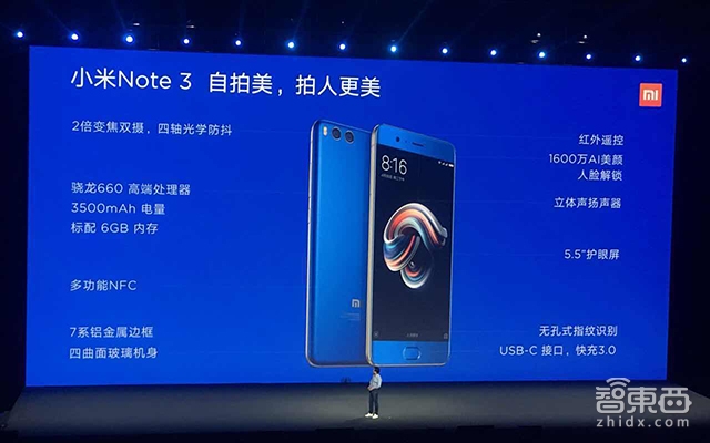 最后小米还推出了另一款手机新品小米Note 3,整体定位是一款大屏幕版的小米6。小米6首次使用了人脸解锁功能,识别速度为500毫秒。
