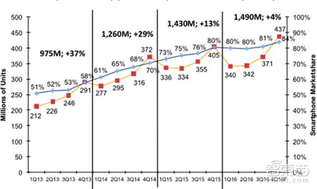 而随着智能手机换机潮的结束,行业增速也趋于平缓。根据IC insights的数据,截止2016年底,全球智能手机出货量增速已经从2013年的37%降到了4%。
