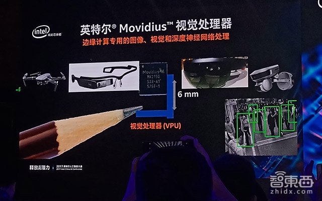 在端智能方面,英特尔还推出了Movidius Myriad 2 VPU视觉处理芯片。Movidius是2016年9月被英特尔收购的硅谷公司、Myriad 2是这块芯片的名字,Myriad 1曾经被用在谷歌的Tango平板里、VPU则是Vision Processing Unit视觉处理单元的缩写。